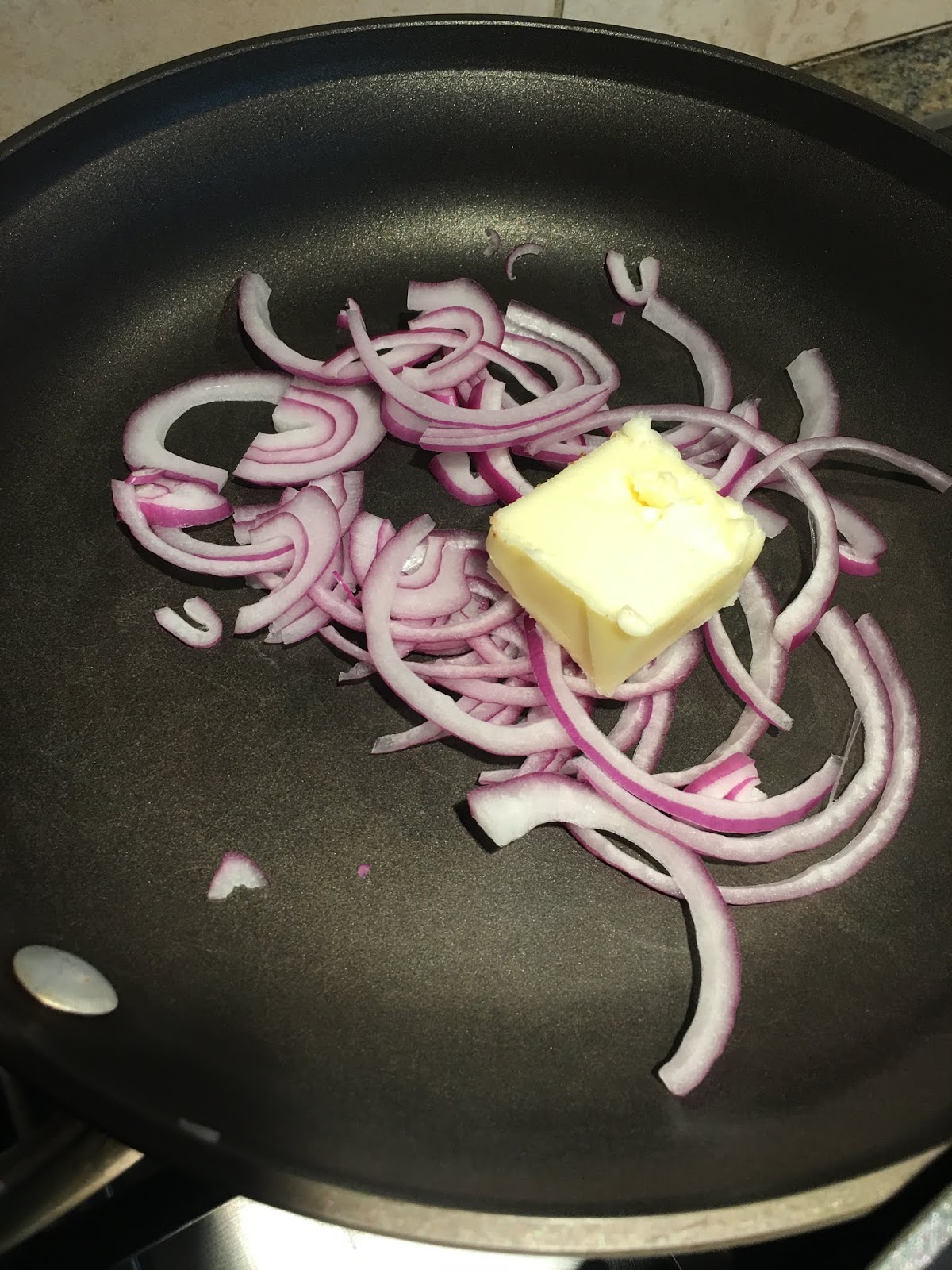 I sautéd a quarter of a red onion in a pat of butter, then added the zucchini just to heat it up but not to cook it because the noodles would wilt.